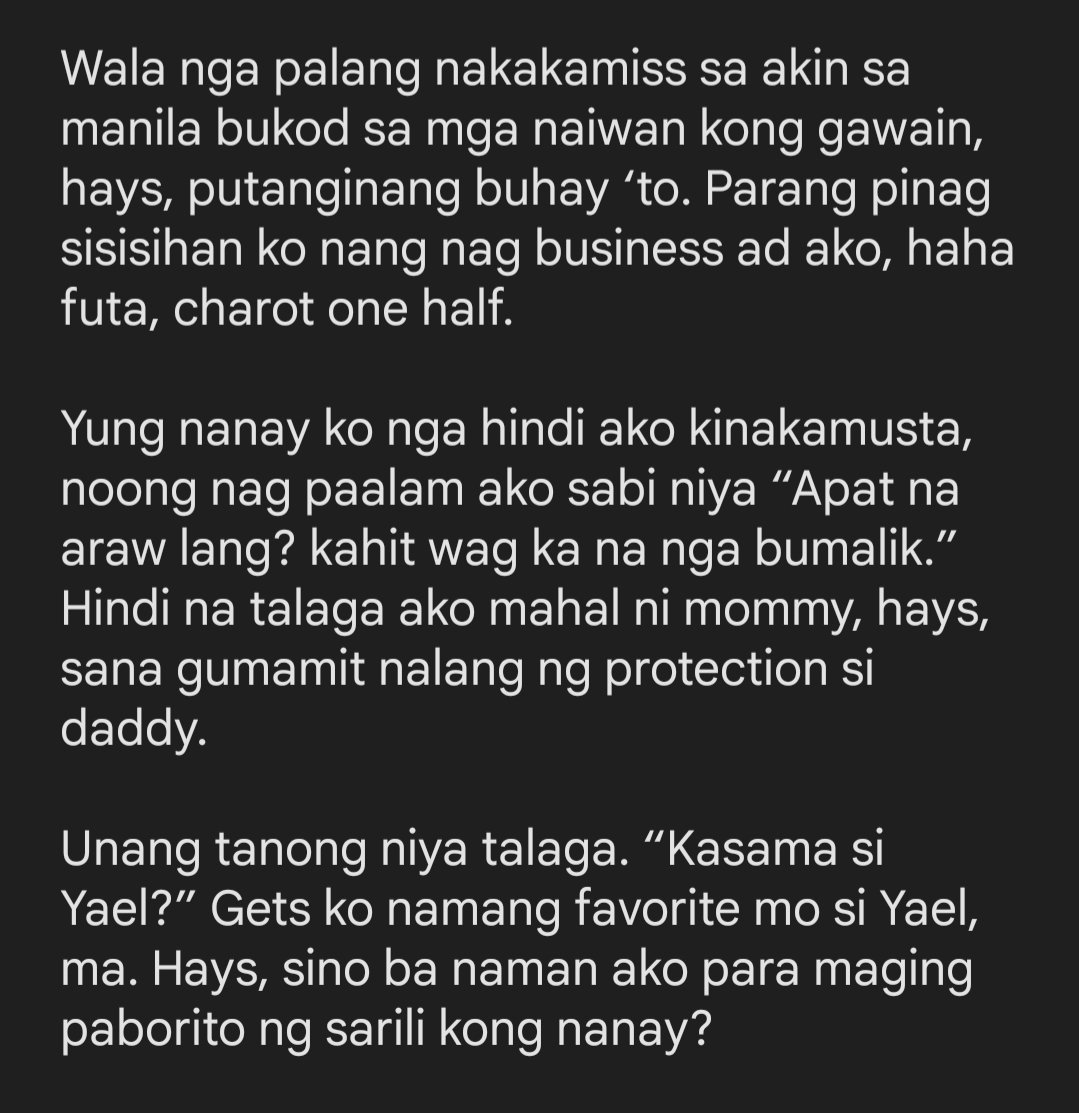 Tapos sabi niya ako daw tinanong siya bakit. Malelate na ako sa trabaho. I hate you dapat kasi gago ka Paasa na babaero pa.